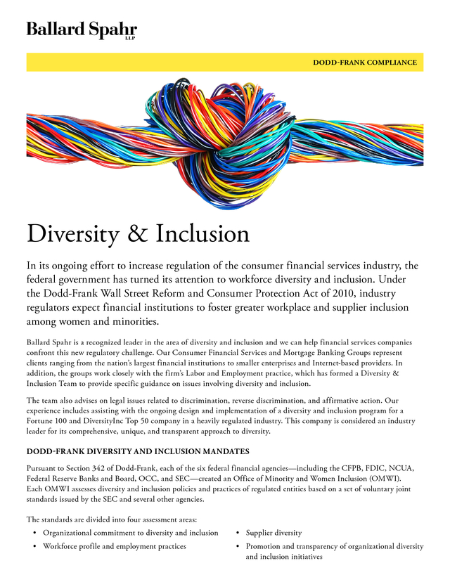 Section 342 dodd frank wall street reform and consumer protection act 2016 report to congress 3 introdction inclusion strategic plan annually and updates it as needed to refine the agency s efforts in promoting diversity and inclusion on an ongoing basis. Section 342 of dodd frank empowers these owmis to examine the diversity practices of their respective contractors and subcontractors and to make referrals to the office of federal contract compliance programs ofccp in some instances where deficiencies are found. The law overhauled financial regulation in the aftermath of the great recession and it made changes affecting all federal financial regulatory agencies and almost every part of the nation s financial services industry.
