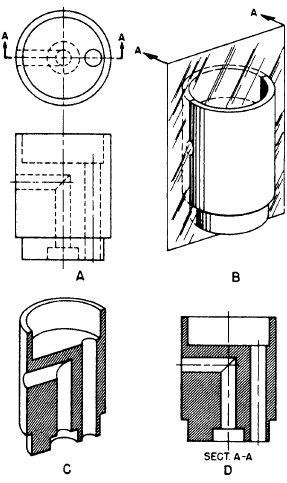 When sketching an object or part that requires a sectional view they are drawn by eye at an angle of approximately 45 degrees and are spaced about 1 8 apart. In this view the cross sectional shape of ribs spokes and other projections of the object are featured. Section lines are very light.